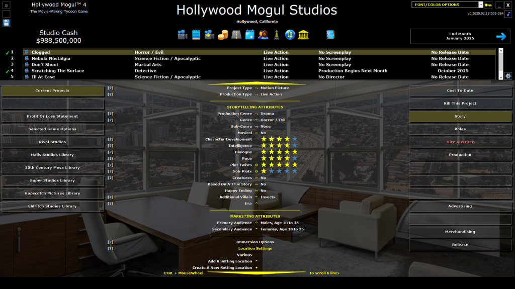 В апреле 2025 года вышла последняя на данный момент часть симулятора голливудского кинобизнесмена. Она разрабатывалась довольно долго, де Вуоно собирал средства на Kickstarter несколько лет, чтобы реализовать все свои планы. Как и прошлые части, четвертая не балует игрока ярким визуалом, но за 30 лет внутриигровые механики развились до состояния настоящей симуляции кинорынка и процесса создания фильма.