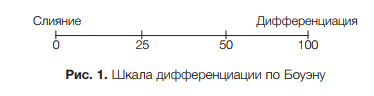 Боуэн ввел понятие шкалы дифференцированности «Я» (рис. 1). Она носит чисто умозрительный, иллюстративный характер и представляет собой попытку классифицировать на одной оси все уровни дифференциации, не проводя при этом прямой корреляции (связи) с интеллектом или социальным, экономическим или иным статусом человека. Шкала оценки уровня дифференциации начинается от самого низкого уровня, соответствующего нулю, и завершается максимально теоретически возможным, соответствующим ста процентам.