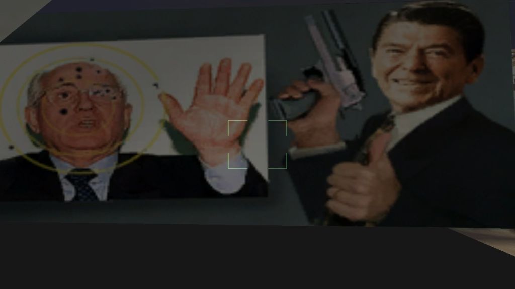 Правда, непосредственно в сюжете Михаил Сергеевич не появляется, но обнаружить его можно — причем в компании коллеги, президента США Рональда Рейгана. Для этого нужно отправиться в магазин Ammu-Nation в центральном районе города (Даунтаун), предварительно разжившись гранатометом. Добравшись до места, помещаем нашего персонажа на прилавок спиной к витрине с винтовками, активируем прицел гранатомета и разворачиваемся на 180 градусов — к витрине. Если всё сделано правильно, вы увидите грубовато нарисованную картинку, на которой Рейган использует главу СССР в качестве мишени. Такие вот хиханьки-хаханьки.