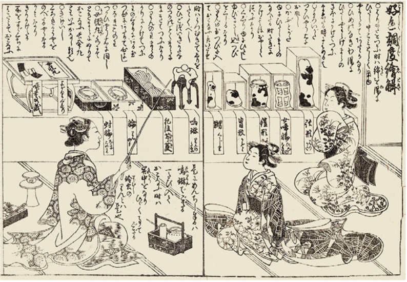 В эпоху Токугава индустрия шагнула вперед — у мастеров можно было приобрести искусственные вагины из кожи, которую наполняли теплым желе, первые контрацептивы, лубриканты, вагинальные шарики, растительные афродизиаки и аналоги «Виагры».