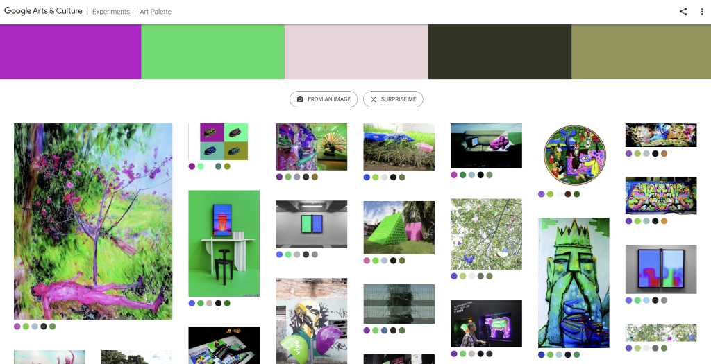 Работает это так: алгоритм компьютерного зрения изучает пиксели, усредняет их цифровые коды и вычисляет пять новых и репрезентативных. Отталкиваясь от них — подбирает арт-объекты из музейных архивов с самыми близкими оттенками.