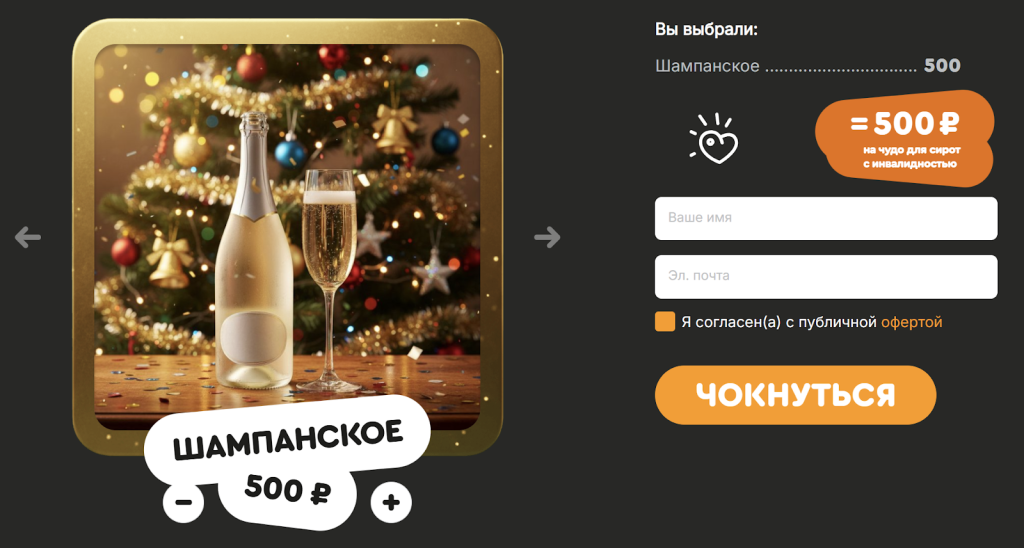 Определитесь в виртуальном алкомаркете «Чокнемся!» с праздничным напитком, от которого готовы отказаться ради благородной цели (да и собственного здоровья). Например, от бутылочки игристого или обычного вина, водки, виски, бокала или целого кейса пива. Если вы и так не не планировали пить в новогоднюю ночь и не хотите даже представлять себе алкоголь — можете отказаться от стакана сока.