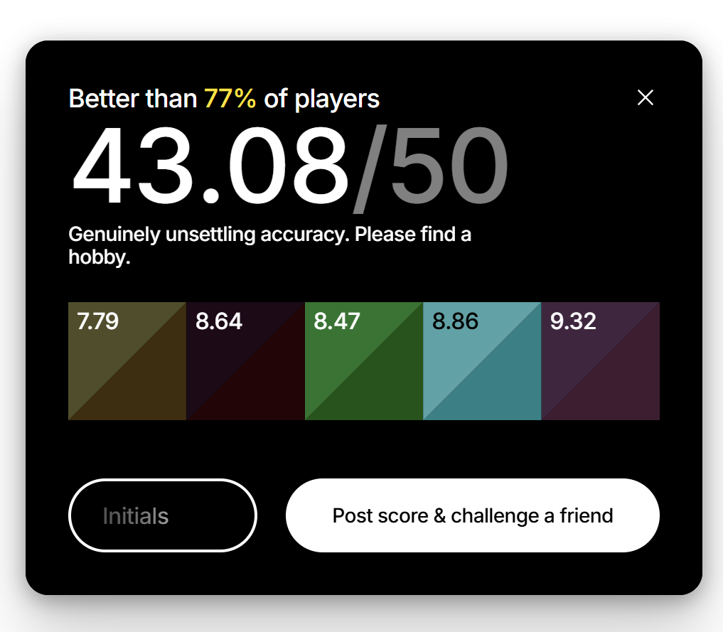 Вам покажут квадрат определенного оттенка. У вас будет пять секунд, чтобы его запомнить. После этого вам предложат его воспроизвести с помощью ползунков на цветовой схеме и покажут процент совпадения.