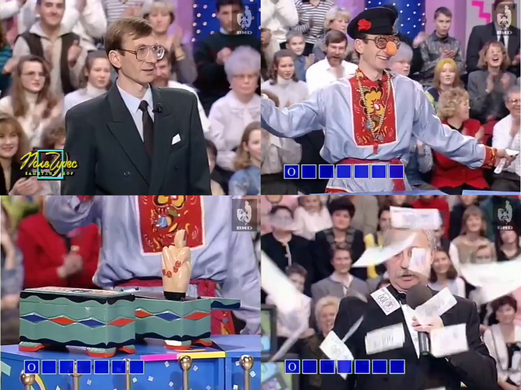 Игрок распахнул вторую коробку и воскликнул: «Ловите!» Из коробки выпорхнула пачка денег, перелетела через барабан и приземлилась прямо в Якубовича.
