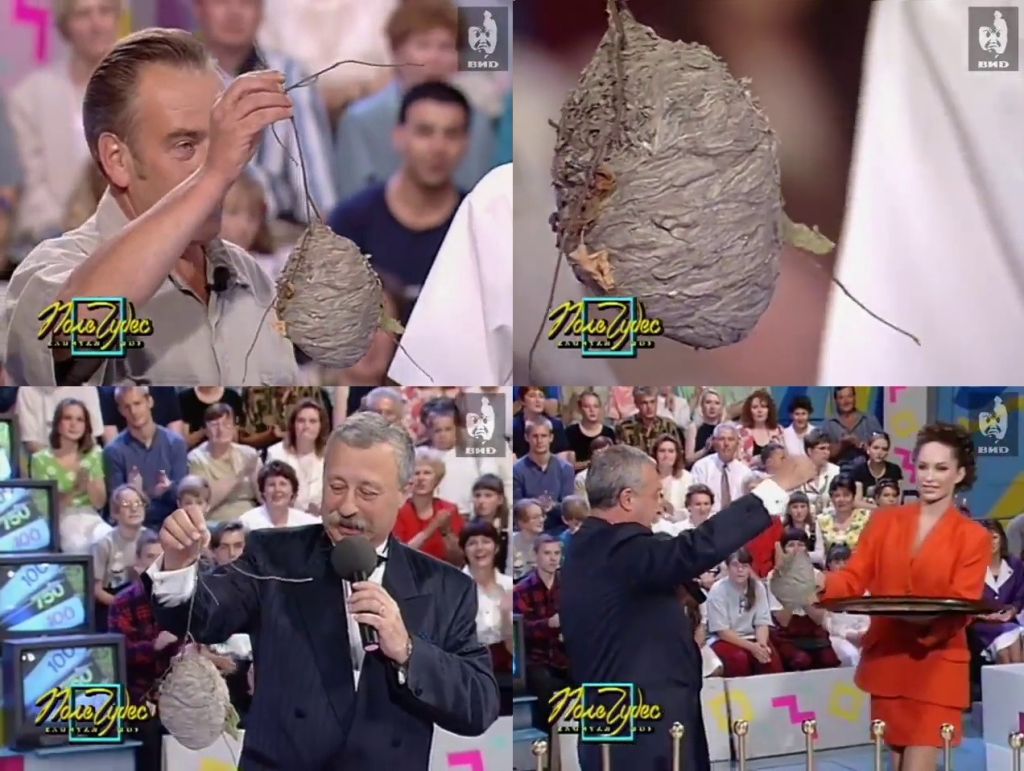 Когда дело дошло до вручения подарков, Ходорченко вынул ветку с висящим на ней эллипсоидом серого цвета, сообщив, что это «лесной трофей», по счастью, пустой. Да, это было осиное гнездо — настоящее. Причем появилось оно не случайно, а в качестве метафоры телевизионного центра.