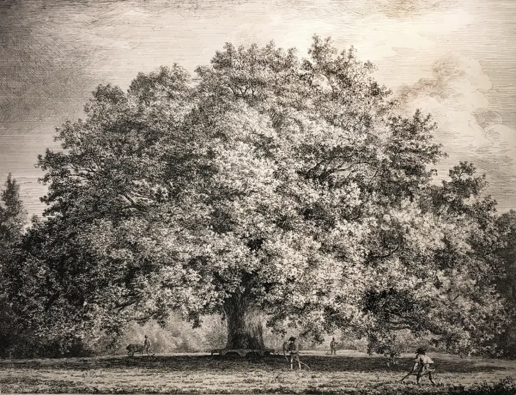 В центре этой рощи стоял дуб, в остальном красивый и стройный, у которого посередине ствола выпирал большой нарост. На этом наросте поселилась пара воронов, которые прожили там столько лет, что и сам дуб удостоился от местных звания «Воронье дерево».